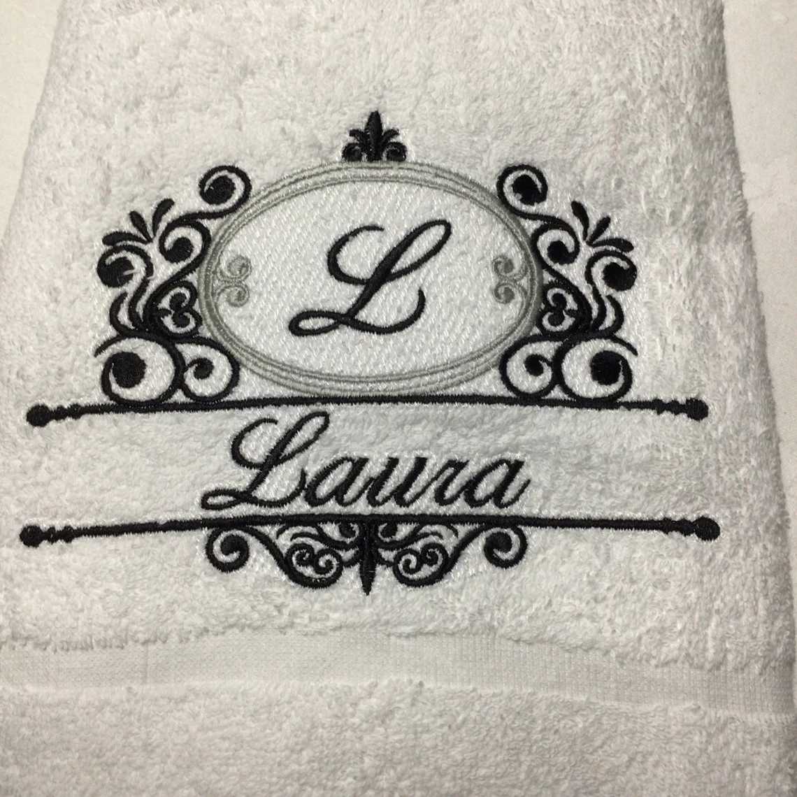 Each towel is then machine embroidered with a monogram design, measuring approximately 18cm x 12.5cm The name on the towel will vary in size depending on its length.